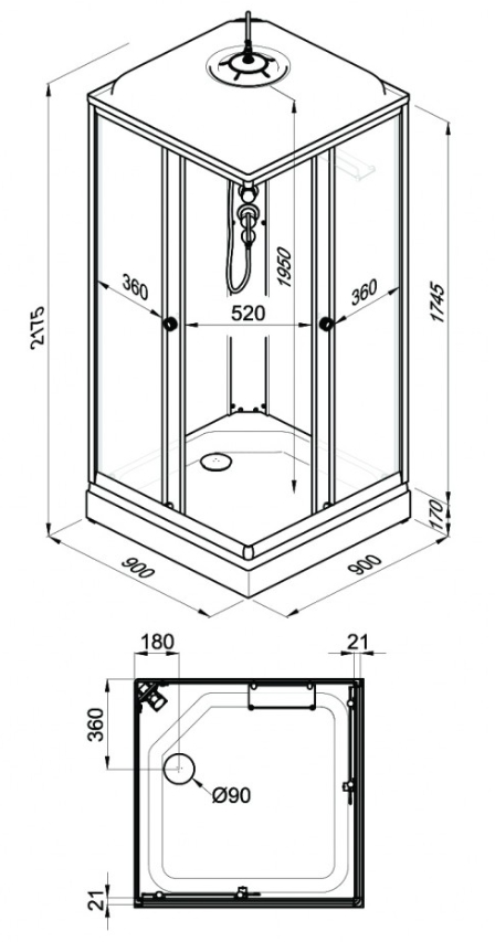 Технические характеристики (ТТХ) душевой кабины Тритон Вельвет-К 90×90 А (6 мест + сифон D90)