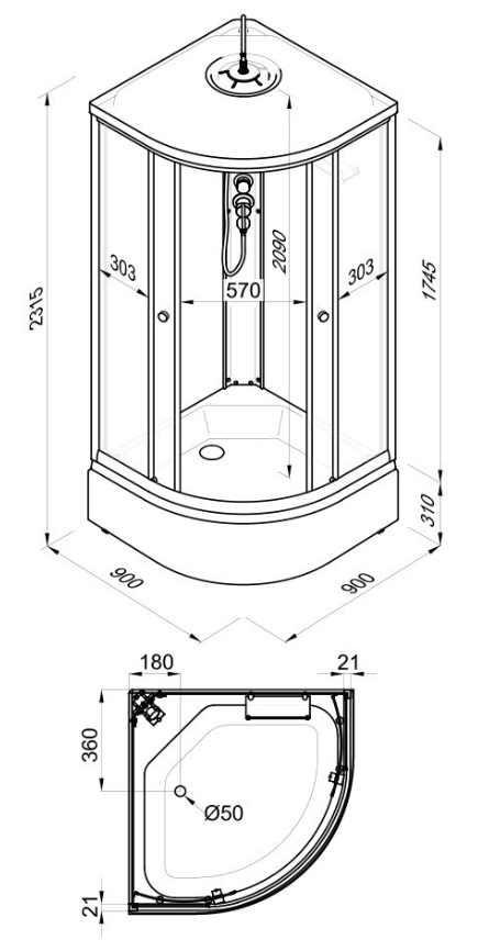 Технические характеристики (ТТХ) душевой кабины Тритон Грэй-Вайт 90×90 А (7 мест + сифон D50, декор. крышка)